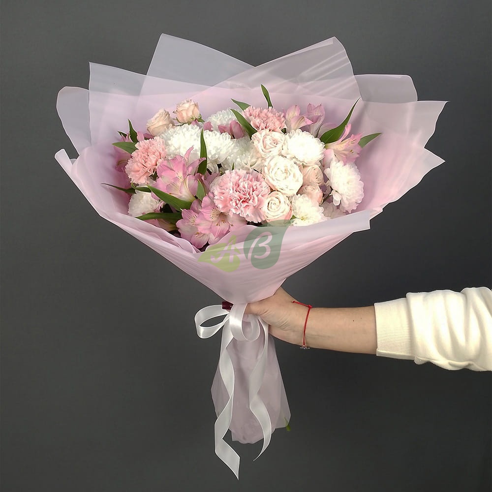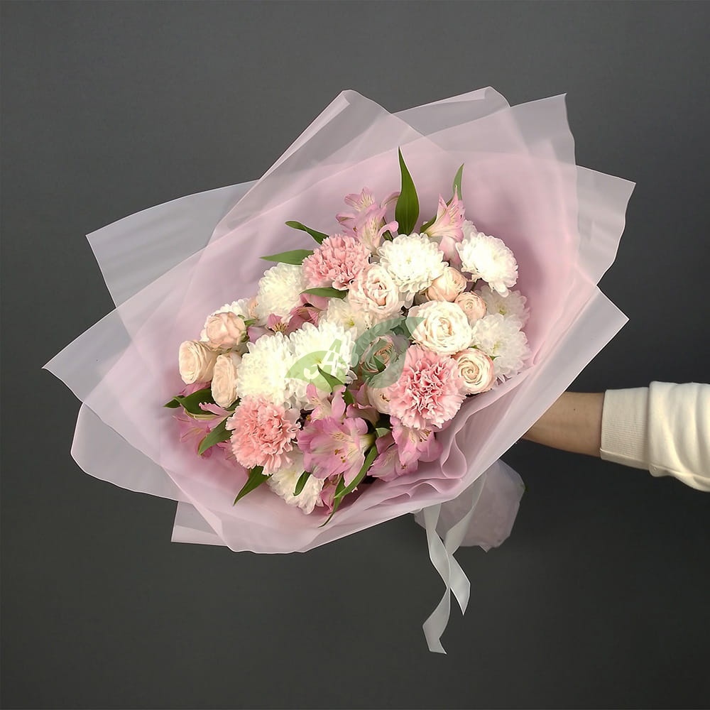 Букет из белых хризантем, розовых кустовых роз и розовой альстромерии – это сама нежность в вазе. Выпускной, 8 марта, свадьба, выписка из роддома – каждый праздник хорош для этих цветов с доставкой.